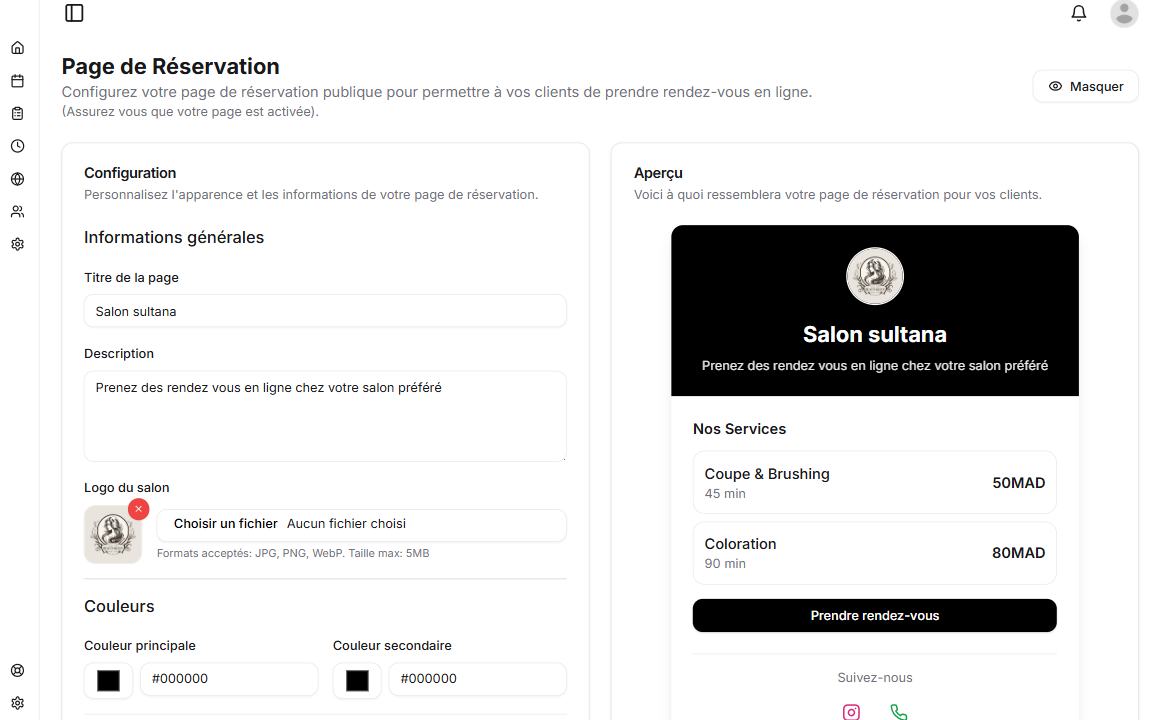 Dans votre tableau de bord, allez dans 'Page de Réservation' où vous pouvez personnaliser les couleurs, ajouter votre logo, modifier les textes et configurer vos services. Votre page sera automatiquement mise à jour en temps réel.
