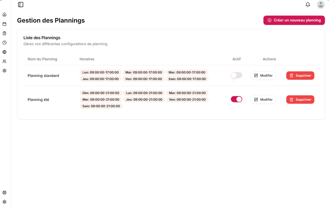 Définissez et ajustez facilement les horaires d’ouverture de votre salon. Gérez vos jours de fermeture, vos plages horaires spéciales et assurez une organisation optimale pour vos clients.