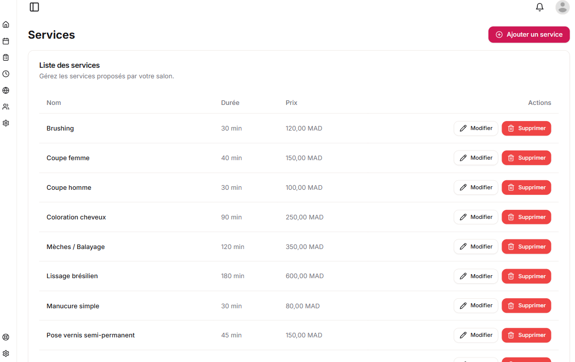 Créez, modifiez et organisez vos prestations avec leurs prix. Identifiez facilement vos services les plus populaires pour adapter vos offres et maximiser vos revenus.